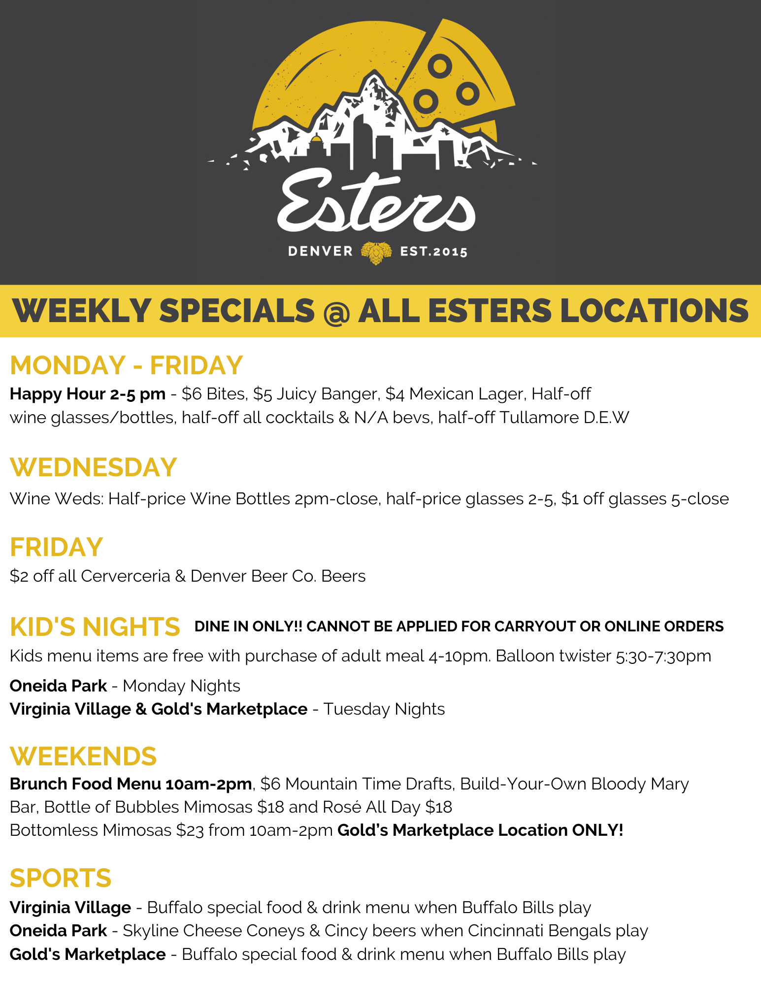 CURRENT SPECIALS @ ALL ESTERS LOCATIONS: